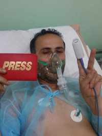 The picture here is of Fahem Boukadous, hospitalized with acute asthma, probably in Sousse, Tunisia, last month, just before being sent to prison for four years. He somehow manages to to flash the peace sign with the fingers of one hand, and hold up his press card with the other, this despite being attached to an oxgyen machine.