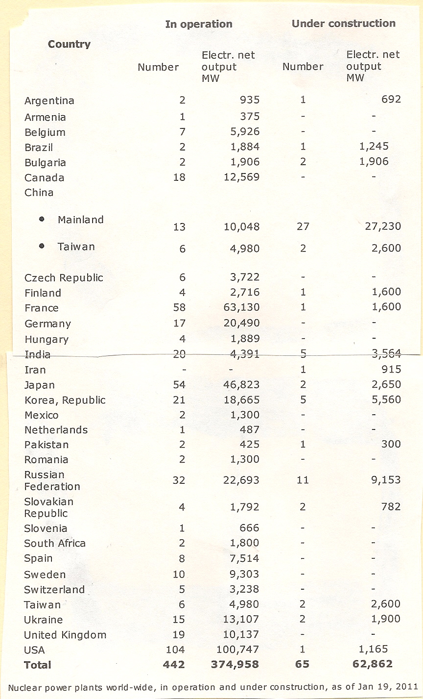 At one time during the Nixon years, there was a plan afoot to build 1000 nuclear reactors in the USA to counter U.S. growing dependence on Middle East oil. Didn’t happen but the results were serious enough. According to the European Nuclear Society there are currently 441 nuclear energy plants worldwide, another 65 currently under construction and some 324 others on the drawing board. Nearly a quarter of those operating worldwide are in the United States (104), almost double the number of the two countries with the next most numerous facilities (France – 58, Japan – 54). The Russian Federation comes in a distant fourth with 32 nuclear power plants. South Korea (21), India (20), United Kingdom (19) China (13 on the mainland and 6 on Taiwan) and Canada (18) all also make extensive use of nuclear energy.