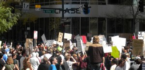 Here in Denver yesterday a massive demonstration – I believe as many as 5000 people marched through downtown Denver – first past the local offices of the federal reserve, then down 17th street – one of two of Denver’s financial centers. The demonstration came the day after the city and the state removed the `tent city’ which had been erected by Occupy Denver activists. According to the press several dozen demonstrators were arrested. That was on Friday. After yesterday’s demonstration which was spirited but entirely peaceful, several hundred people stayed behind between Colfax and 14th Ave on Broadway. There were some arrests made as the demonstrators refused to leave the street.