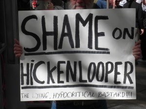 Hickenlooper is Colorado's governor, John Hickenlooper who in the same breath, visited the Occupy Denver tent camp claiming that he believes in `free speech' while ordering the state patrol to tear down the tent city while he was speaking... thus the unkind poster, of which there were many similar ones yesterday