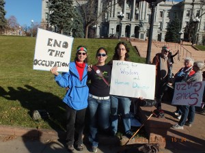 The Fey – Princes join about 125 others – half of them at least young Palestinians living in the Denver area, to protest the Israeli carpet bombing of Gaza. Nancy’s sign says `End the Occupation’, Molly’s says `Calling for wisdom and human deceny’