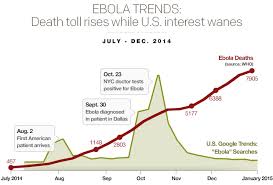 As the U.S. media lurches from one international crisis to another in network stampedes to break stories before their competitors, something gets lost along the way. The way that the ebola crisis was first covered, magnified and the dropped out of sight is a case in point. The graph above, first published at CBS News on January 8, is telling: while the cases of ebola continue to spike in West Africa, concern about the condition here in the United States is plummeting. As the cases in the United States shrank, “Google searches” collapsed accordingly.