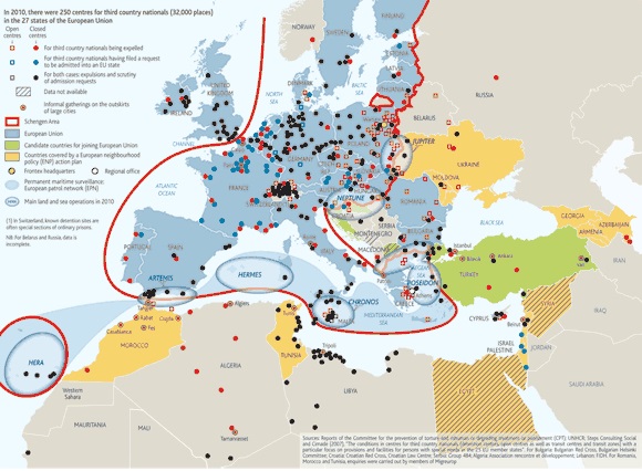 The overall immigration picture in Europe in 2010 was the following: there were at that time, as the map indicates, some 250 centers in European countries for “third country nationals,” a euphemism for undocumented immigrants, in the 27 countries of the European Union. This does not count numerous holding tanks, expulsion and processing centers in North Africa, the Middle East, and according to this map anyhow, the post Soviet republics of the Caucuses. Again, according to this map, whose sources are listed at the bottom right of the map, these combined 250 center have the capacity of “holding,” “processing” some 32,000 people, a statistic which becomes less and less impressive the more we realize that the predictions for migrant flows into Europe – including those that drown trying to make the crossing by boat at somewhere between 300,000 and 400,000 this year alone.