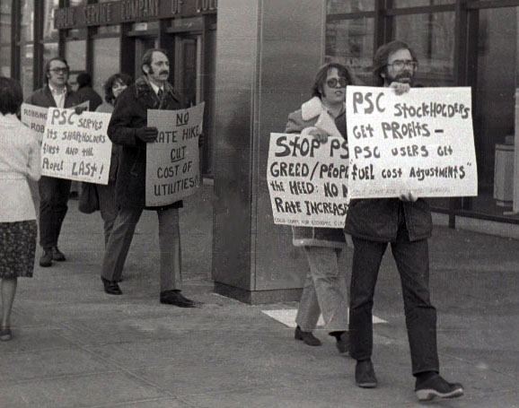 September, 1979 – Harry Nier – third on the left with the sign “No rate hikes, cut the cost of utilities.” Immediately behind him, part hidden, Elaine Schell; behind her Dick Ayre. In front of Harry, Danny Graul, leading the pack with the sign “PSC stockholders get profits, PSC users get fuel cost adjustments” is Jack Galvin.