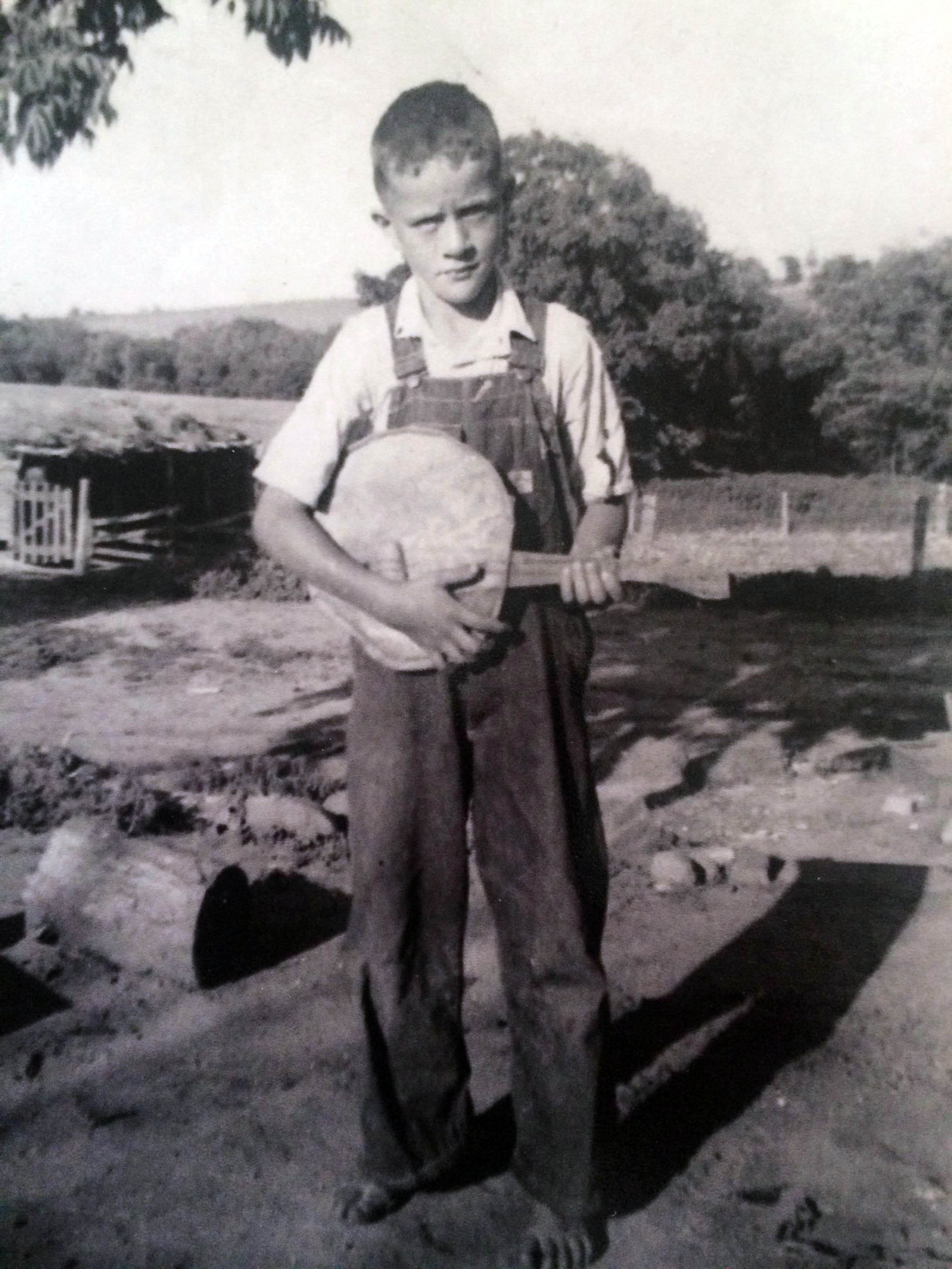 Jim Davis, approximately the age of 9, in around 1938. He’d made his own banjo out of the top of an axle grease bucket lid, a stick and bailing wire for strings. The fact that it didn’t work in no way deterred Jim from playing it and singing anyhow. His favorite song, appropriately enough in those hard times was “Keep On The Sunny Side.” He would sit on the south hay mow (part of a barn where the hay was stored) and sing with siblings.
