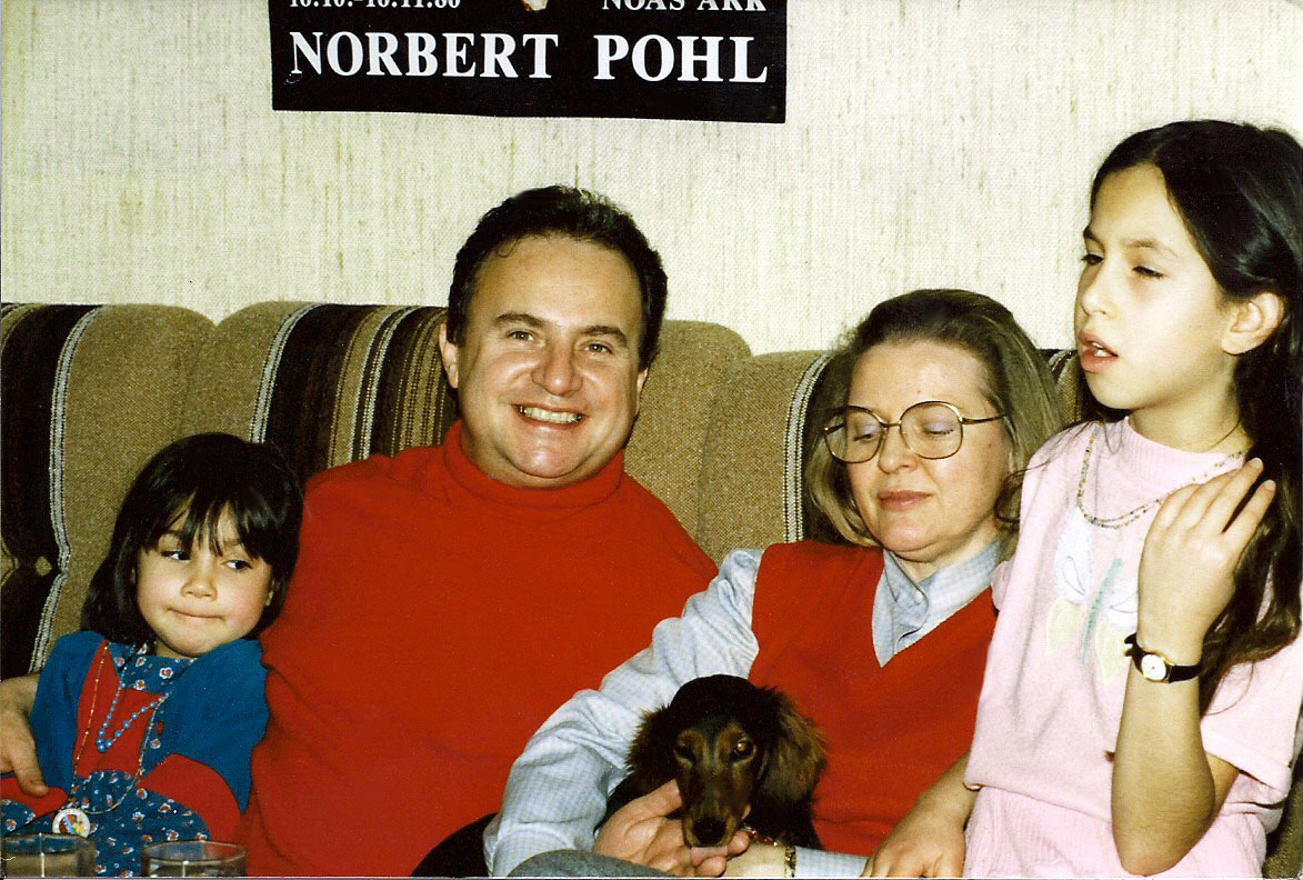 December, 1987. Allison Huguenin holding Pixie. Abbie looking on next to Pierre, Molly standing by Alison. The picture is taken in our apartment in Kaivoksela, Finland just north of Helsinki.