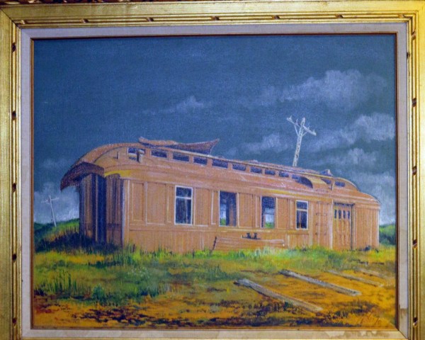 The tramway car, in which church services began in 1949. The picture hangs in the church all