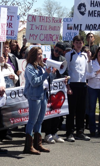 Sole Garcia addressing the April 30, 2017 rally in front of the Denver Archdiocese