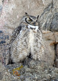After a long day of wild life photography (it’s easy at Rocky Mountain National Park – pretty much every place you turn around elk, deer, mountain goat, and bird life galore are present) I pulled into the Estes Park parking lot just off of the town library. Nearby, three or four people with what I can only describe as “bazooka-like” telephoto lens were shooting away at cliff nearby. For the life of me, I couldn’t see what it was they were photographing. So I asked one of them. “A mother great horned owl and her two (rather sizable) owlet chicks” was the answer. Their natural coloring camouflaged the owls so effectively, that, although they were on a cliff ledge less than 150 from where I was standing, it was only after a thorough search of the rocks above that I was finally able to make out the trio. What a treat.