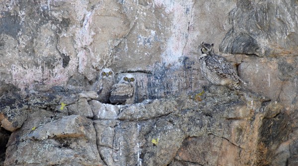 Estes Park’s Great Horned Owls: owlets on the left, Mama on the right