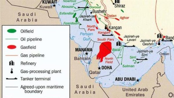 South Pars natural gas field, the large red item in the center of the Persian Gulf, between Qatar and Iran