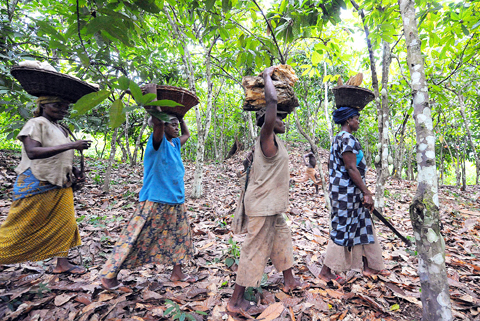 Women farmers carry wood as they leave a cocoa plantation on October 18, 2008 near the village of Boko, some 200km north of Abidjan, where a group of women have created in 2005 an association of coffee-cocoa producers. Cocoa farming in Ivory Coast, traditionally undertaken by men, has recently become an activity for some women who do not hesitate to defy traditions to engage in this activity with the hope of a better life. AFP PHOTO / ISSOUF SANOGO