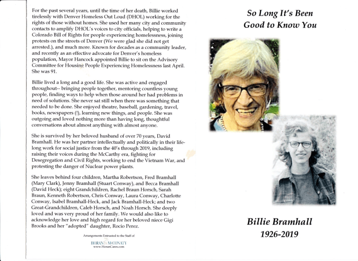 These last years – well into her 90s – she worked hard for the rights of the homeless, working closely with Denver Out Loud, effective mass-based movement of homeless people. Billie worked hard against Denver’s repressive “camping ban” denying homeless people the rights to rest on public property and was actively in support of Initiative 300 (which failed) that was put before Denver voters to rescind that law.