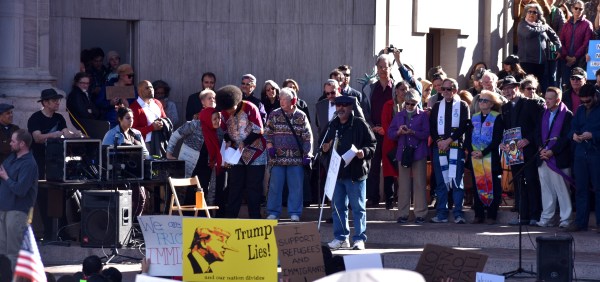 Dr. Ali Zarrin, Persian-American poet, reading his epic poem on Immigration, Immigration Rights Rally, Denver. February 4, 2019