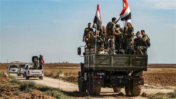 Military forces of the Syrian government liberating Maarat-al-man in Idlib Province from Al Qaeda and like elements.