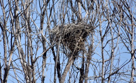 Besides the striking sexual dimophism – the females so plain in contrast to the striking colors on the males head and neck there is something else curious about wood ducks: they nest in trees! If I remember right they are among the only ducks whose eggs hatch so far off the ground, most a protected environment, although there a snakes who are in the know and are known to make their way up into the nests and eat the eggs. A little further down the path, just off to the side were several tree nests. Can’t say for sure they are wood duck nests, but they seemed unusually large for bird; here’s a photo of one anyway. There were several about that size in trees nearby this one.