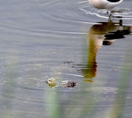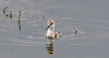 She was watching over an avocet chick. Now the alarm calls made sense. The little one was having trouble staying afloat. It would surface, try with its little wings to stay afloat, sink back in the water. Despite the fact it was only a few inches deep there, the chick could not stay afloat. And all of a sudden there I was watching a heart-wrenching scene. The chick was drowning. The male adult’s dilemma was clear; he was caught between protecting the two chicks feeding on the one side of the pond, and trying, along with his partner to save the chick in trouble on the other side. Beside himself (so it seemed to me), he flew back and forth in a kind of obsessive-compulsive alarm, not sure which situation needed his attention more.