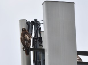 First thing noticed… the red tail hawk couple that often perches on the cell tower across from the Tennyson St. entrance to the Park was back. From where? Who knows. Still they were hiding, or trying to. Rather than perching atop the cell tower as they had done in the past, they were found lower down, at mid level. In fact, I only saw the larger female there, but when I got home and developed the hawk photos on a computer, the body of the mate was visible..