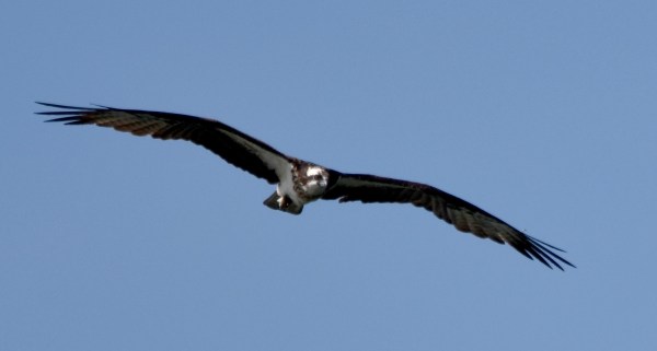 Ospreys are very successful hunters, catching fish on at least one-quarter or more of their dives. What I witnessed this morning is typical: they circle over shallow waters to locate fish below the surface. Once they locate a fish, they hover briefly and then dive into the water feet-first, sometimes becoming completely submerged. Adults are sometimes preyed upon by bald eagles and great horned owls, while eggs and chicks are sometimes taken by snakes and raccoons. I have seen video of the larger bald eagles and ospreys competing for food in Florida marshes. Despite their reputation of strength and prowess, eagles are fundamentally lazy and often let the ospreys do the hard work of fishing, only to attack them in the air and steal the osprey’s prize.