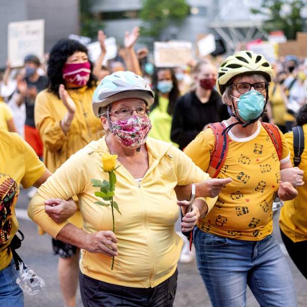 Portland Wall of Solidarity. 60 years ago they marched for their future, now they join arms for the future of their children, all children, everywhere. Mother Earths, wearing mask and helmuts, arm in arm with a rpse in one hand…