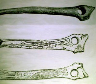 Art carved on an atl atl (a spear throwing tool). It is informational in nature. The give info about the change in seasons and breeding habits of salmon and snakes