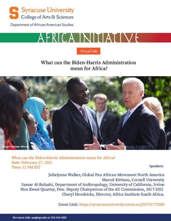 The seismic changes in the USA means that there are many new players and there is need for new thinking on Africa. The new directions that the USA could take with Africa can strengthen its relationship with Africans at home and abroad. What does the newly inaugurated Biden-Harris administration mean for the future of Africa? Africa Initiative is excited to host such a dynamic and insightful group of speakers for a timely discussion.
