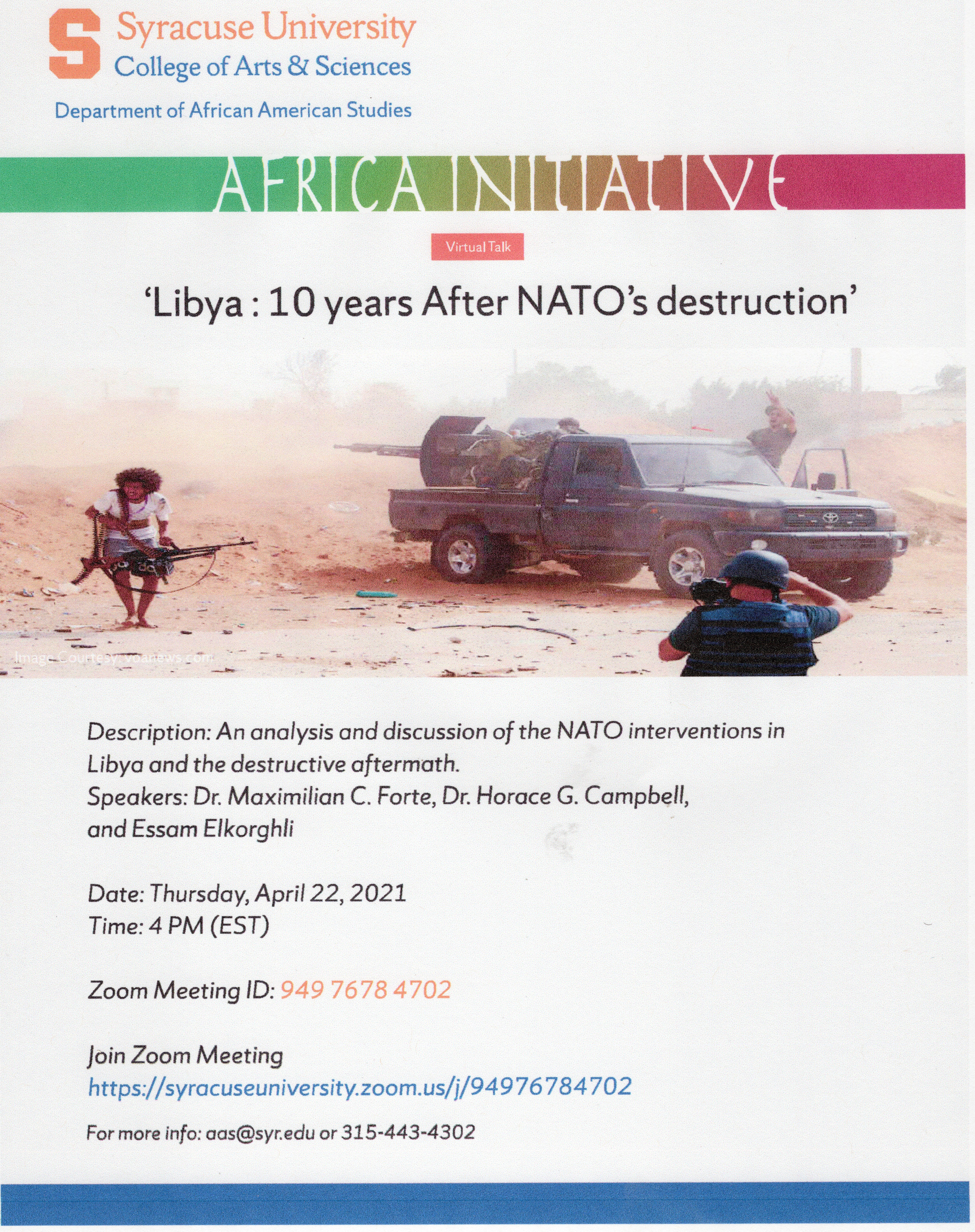 This event will take place in less than an hour. I am sorry to not have posted it sooner. That said, Horace Campbell’s book on the NATO led invasion of Libya is a masterpiece and he is worth listenting to… Am unfamiliar with the other speakers but having watched the other “African Initiative” events this Spring, I am confidence that they will also be “high qaulity”… Ten years ago, the Obama Administration, urged on by one Hillary Clinton, invaded Libya, overthrew the government, watche approvingly the torture and murder of Muammar Khadaffi and celebrated the implosion of one of Africa’s most stable countries into the jungle and horror show that it became.