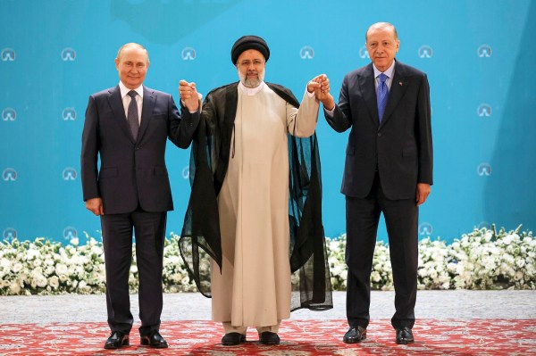 The multi-polarists: Russian President Vladimir Putin, left, Iranian President Ebrahim Raisi, center, and Turkish President Recep Tayyip Erdogan pose for a photo prior to their talks at the Saadabad palace, in Tehran, Iran, Iran, Tuesday, July 19, 2022. (Sergei Savostyanov, Sputnik, Kremlin Pool Photo via AP)