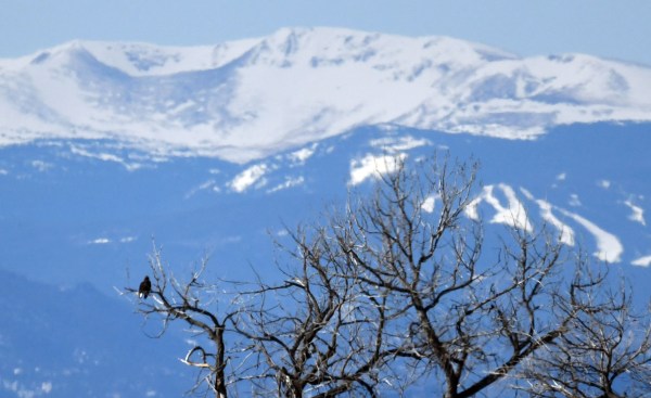 Eaglefest was a great success. Don’t know the numbers but wouldn’t be surprised if hundreds, if not a few thousands of people stopped by Barr Lake this morning. Whole families, plenty of people with cameras and golf cart with cars attached for those who preferred to ride, or who couldn’t walk, the 1.3 miles to the gazebo on the south end of Barr Lake. It sticks out into the lake several hundred feet and from there the view of the birdlife – mostly ducks and eagles – is usually spectacular. But Barr Lake is still mostly frozen and both the ducks and their raptor predators are more likely found on the creeks feeding into the South Platte River and on the river itself. Still, quite the view from the gazebo with majestic Long’s Peak erupting in the background. Dramatic. In the small area about 200 yards into the lake from the gazebo Canada Geese and ducks in the hundreds sit quietly. A lone female Northern Harrier watches the ducks for signs of weakness, feebleness. With a good pair of binoculars an eagle is spotted off in the distance, at least a half mile away, looking out at the mountains.