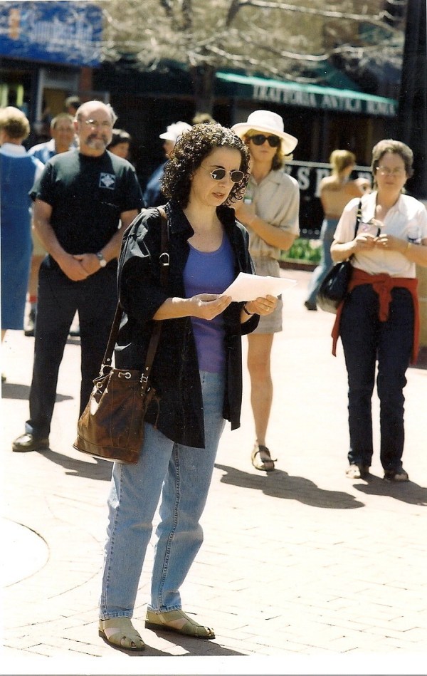Ida Audeh at a Rachel Corrie Memorial on the mall in Boulder, June 2003. In the background Joel Edelstein and Juliet Wittman