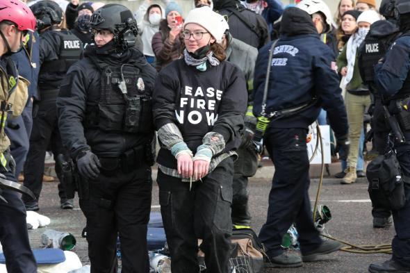 Speer and Champa. December 3, 2023. Jewish Voice for Peace member being escorted to a paddy wagon, getting arrested at a civil disobedience protesting a conference held by the Jewish National Fund in Denver, and in support of an immediate ceasefire which the Biden Administration still opposes months and tens of thousands of Palestinian lives later.