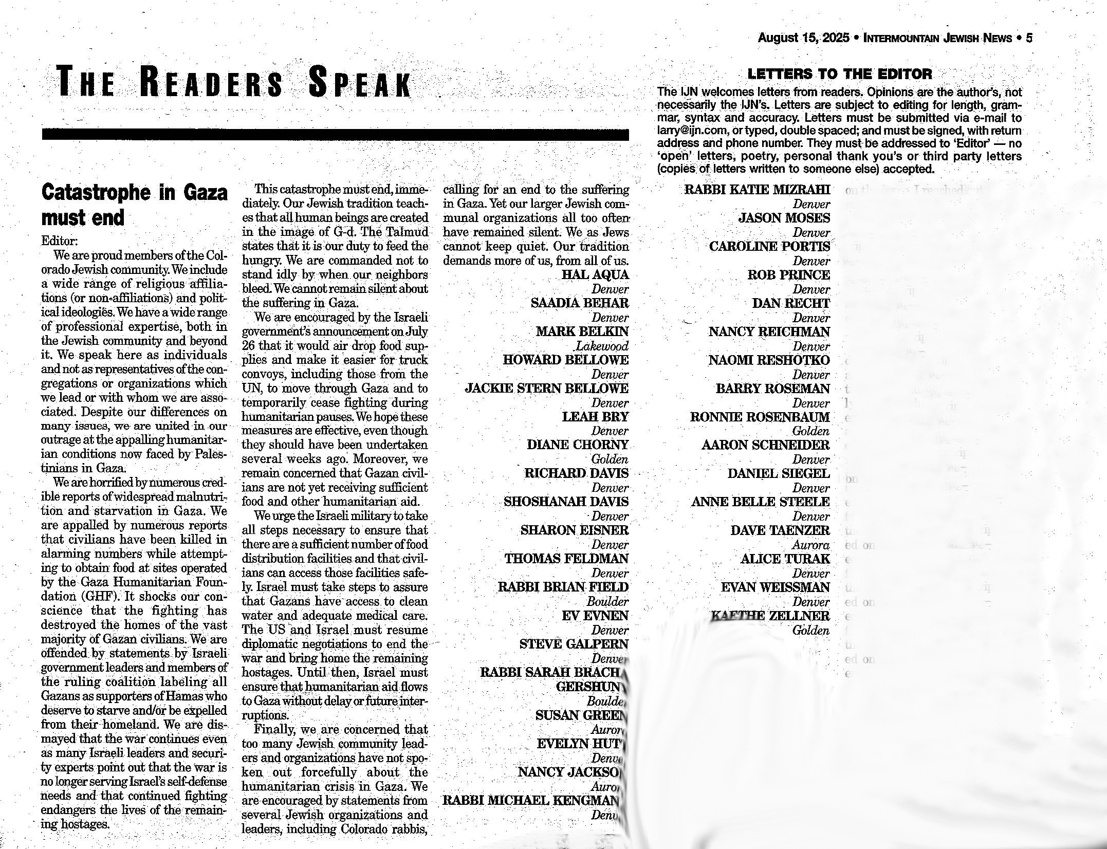 A letter to the editor in the Intermountain Jewish News. August 15, 2025. Note if you having trouble reading this – I recognize the text is small – simple press “Control +). That will blow up the text to more comfortable size to read.