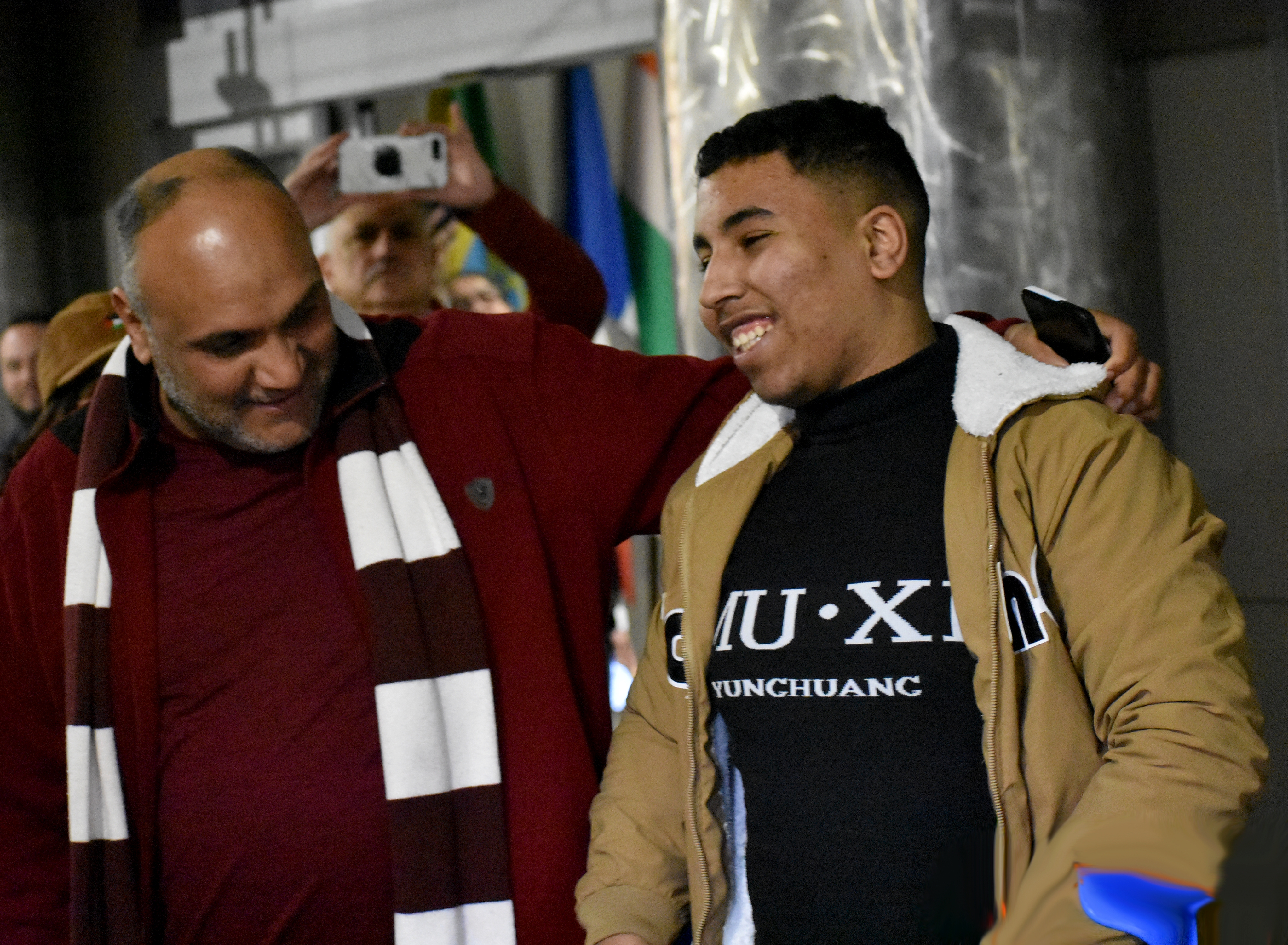 Abdul Aziz arrives in Denver from Gaza and Cairo. He is greated by his uncle at Denver International Airport (late January, 2025). R.Prince photo.
