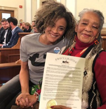 Elizabeth Epps (left) with Penny Goodman after receiving recognition receiving recognition by the Denver City Council for their work supporting prisoner rights. Epps was hit by two rubber bullets in her thigh while monitoring George Floyd support protests in Denver.