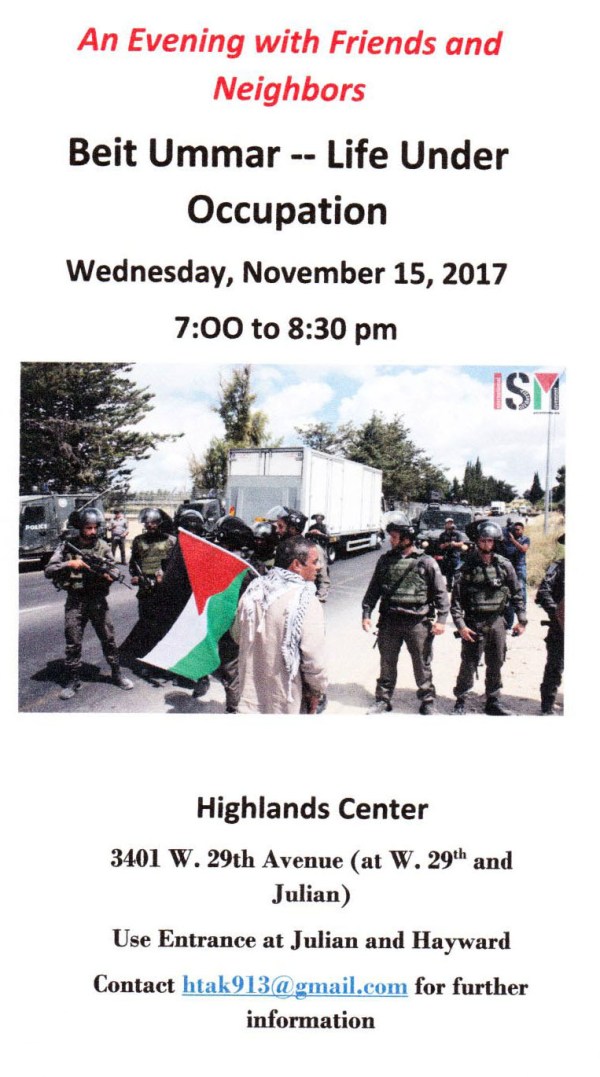 Beit Ummar – Life Under Occupation; Wed. Nov. 15, 2017. 7-8:30; Highland Center. 3401 W. 29th Ave. Denver 80211